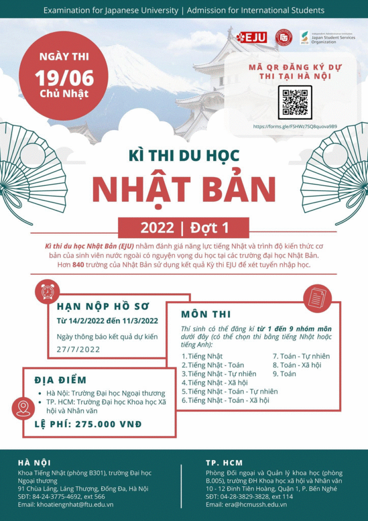 ✅ Không cần phải tới Nhật Bản dự thi, kết quả kỳ thi EJU tại Việt Nam sẽ được các trường Đại Học của Nhật xét tuyển để cấp giấy phép nhập học. Danh sách các trường cấp giấy phép nhập học trước khi sang Nhât, các bạn tham khảo tại đây nhé: https://www.jasso.go.jp/en/eju/examinee/prearrival/index.html ✅ […]