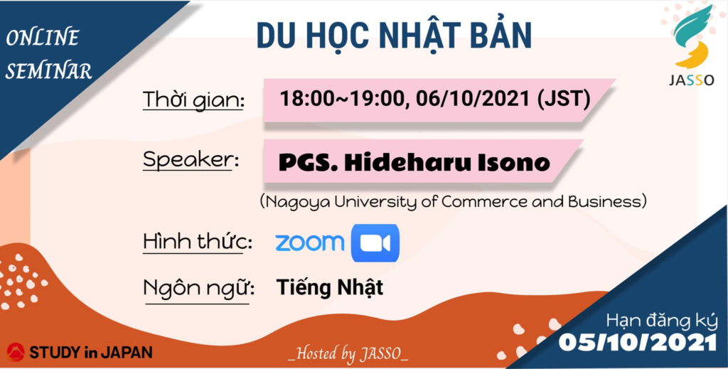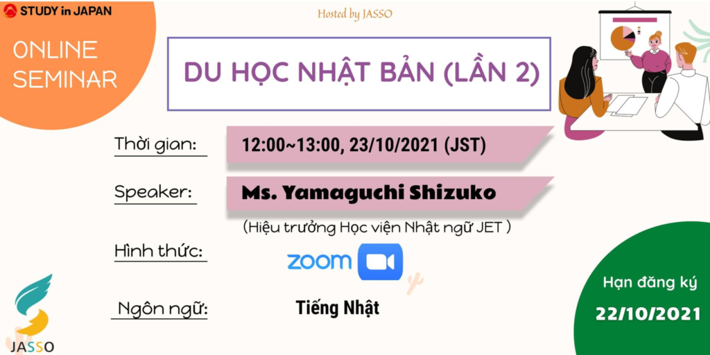 Trong tháng 10 và tháng 11, JASSO sẽ tổ chức 4 buổi ONLINE SEMINAR liên quan đến Du học Nhật Bản với sự tham gia của các Giáo sư, Phó giáo sư, Hiệu trưởng các trường học tại Nhật Bản. Đừng bỏ lỡ cơ hội được lắng nghe những chia sẻ vô cùng hữu ích […]