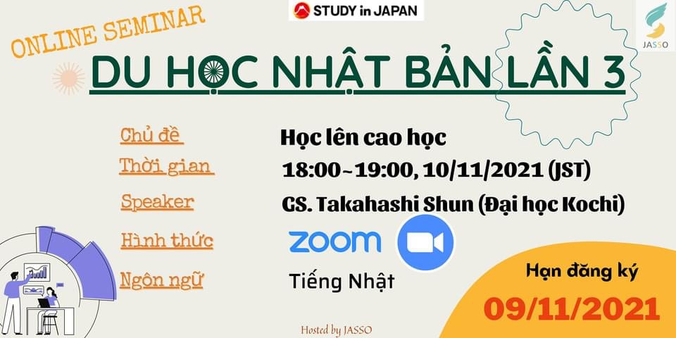 Ngày 10/11/2021, JASSO sẽ tổ chức Seminar Du học Nhật Bản lần 3 với sự tham gia của Giáo sư trường Đại học Kochi. Đừng bỏ lỡ cơ hội được lắng nghe những chia sẻ vô cùng hữu ích của Giáo sư trường đại học Nhật Bản về du học bạn nhé. ONLINE SEMINAR […]