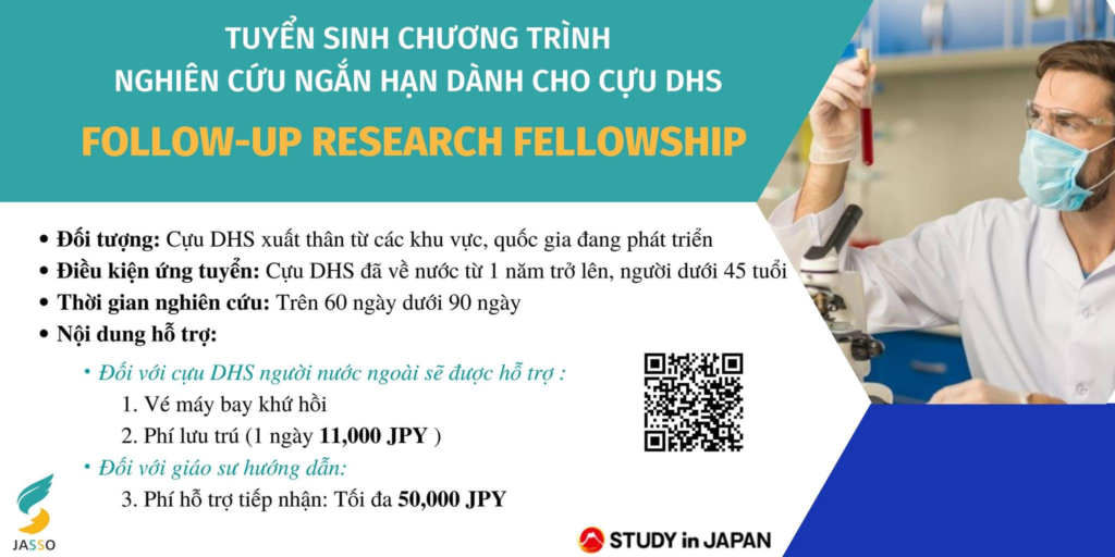 Nhằm hỗ trợ sinh viên người nước ngoài sau thời gian du học, JASSO đang triển khai “Chương trình nghiên cứu ngắn hạn dành cho cựu DHS”. Chương trình này mang đến cơ hội thực hiện nghiên cứu ngắn hạn cùng giáo sư hướng dẫn tại trường đại học của Nhật Bản dành cho các […]