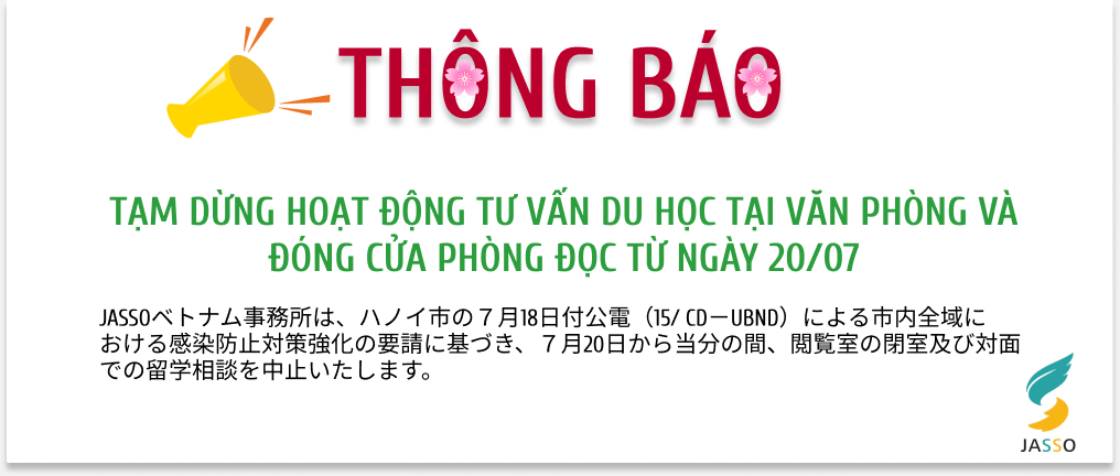 🔹 Theo yêu cầu của công điện 15/ CD-UBND ngày 18/07 của thành phố Hà Nội về việc triển khai các biện pháp cấp bách phòng, chống dịch Covid-19 trên địa bàn thành phố, Văn phòng JASSO Việt Nam sẽ tạm dừng hoạt động tư vấn tại văn phòng đồng thời đóng cửa phòng đọc […]