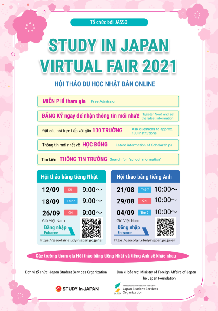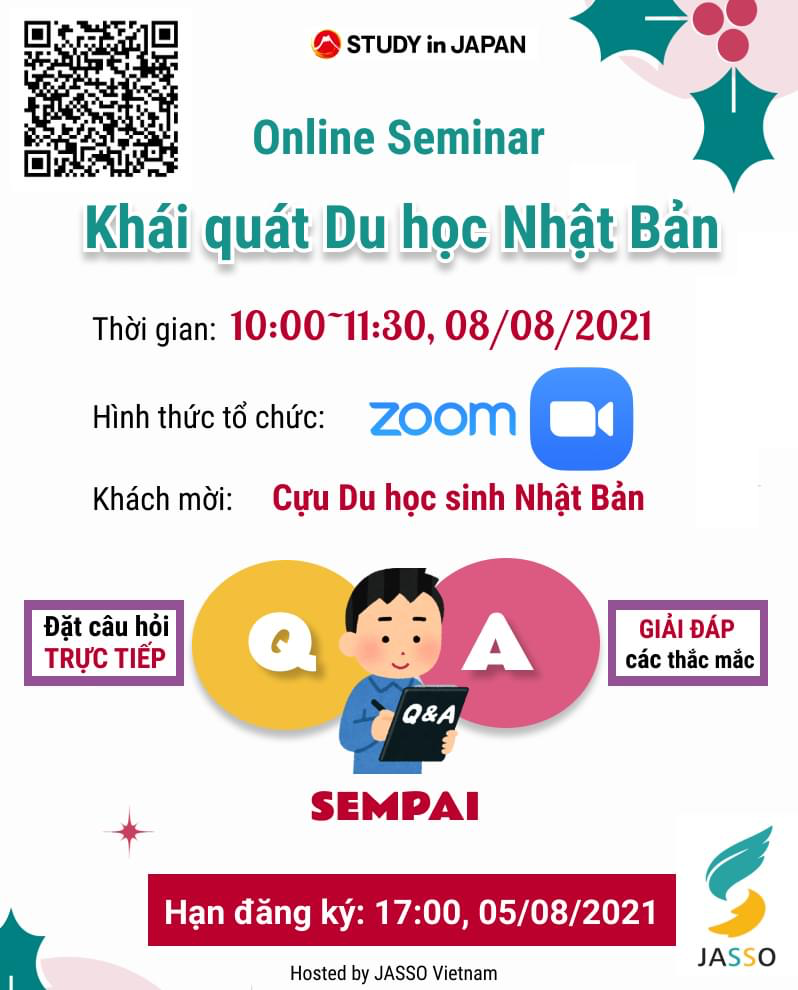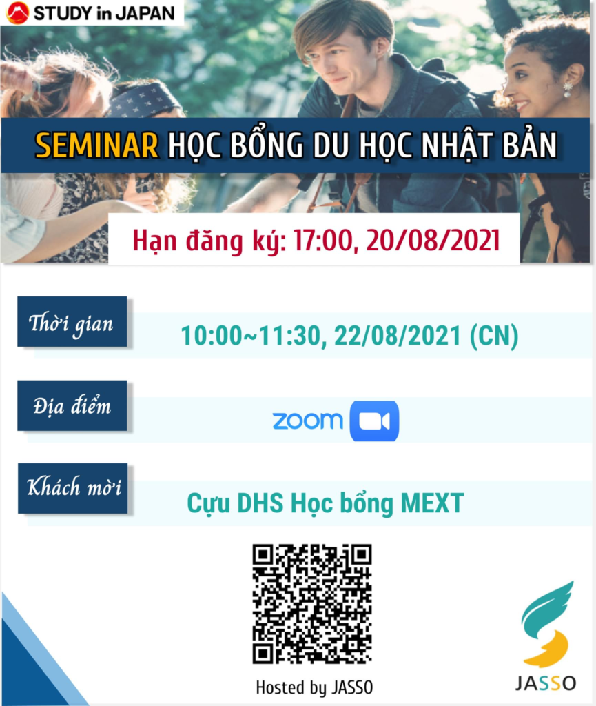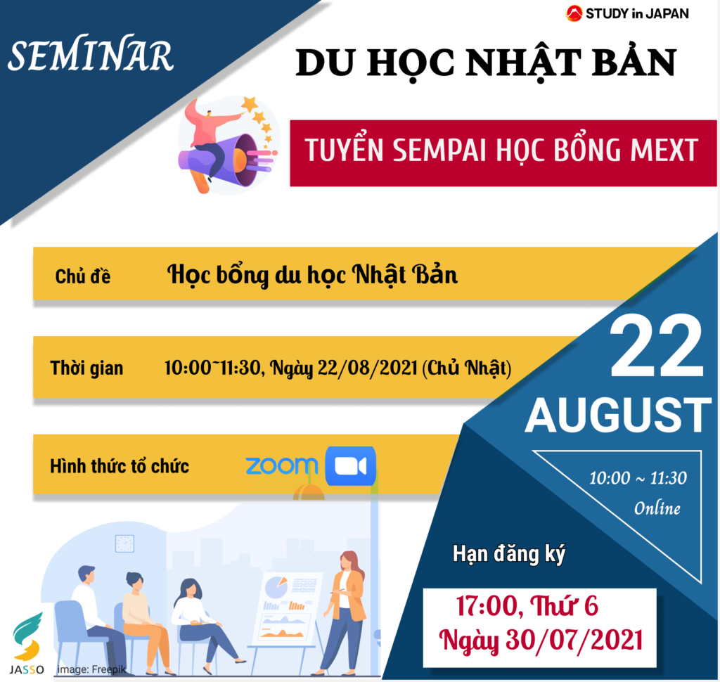 Ngày 22/08/2021 (Chủ Nhật), Văn phòng JASSO Việt Nam sẽ tổ chức một buổi Seminar về Du học Nhật Bản, hướng đến đối tượng là các bạn học sinh THPT và các bạn sinh viên đại học có nguyện vọng du học Nhật Bản. Chính vì vậy, thông qua sự kiện Seminar lần này, chúng […]