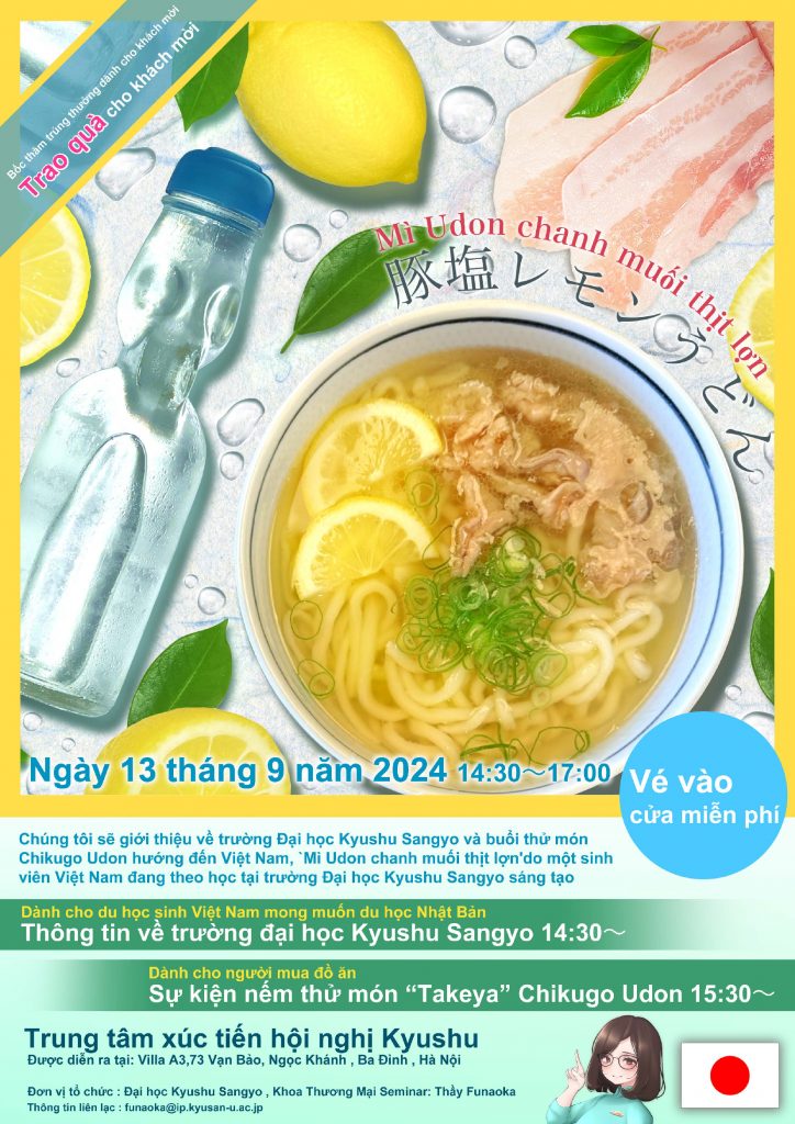 Trường ĐẠI HỌC KYUSHU SANGYO sẽ tổ chức một buổi giới thiệu về trường và nếm thử món “Chikugo Udon” – “Mì Udon chanh muối thịt lợn” do một sinh viên người Việt Nam đang theo học tại trường Đại học Kyushu Sangyo sáng tạo. Thời gian: 14:30 ~ 17:00, Ngày 13/9/2024 (Thứ 6) Địa […]