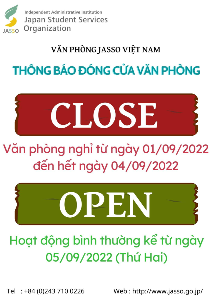 Văn phòng JASSO Việt Nam nghỉ làm việc từ ngày 01/09/2022 (Thứ năm) đến hết ngày 04/09/2022 (Chủ nhật).