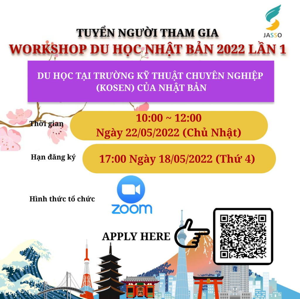 Vào ngày 22/05/2022 (Chủ nhật) Văn phòng JASSO Việt Nam sẽ tổ chức một buổi Workshop du học Nhật Bản hướng đến đối tượng là các bạn học sinh THCS, THPT.v.v. có nguyện vọng du học vào trường Kỹ thuật chuyên nghiệp KOSEN của Nhật Bản. Vì vậy, chúng tôi muốn tuyển người tham gia sự kiện lần này. Các bạn có nguyện vọng tham gia vui lòng đọc kỹ thông tin dưới đây trước khi đăng ký.